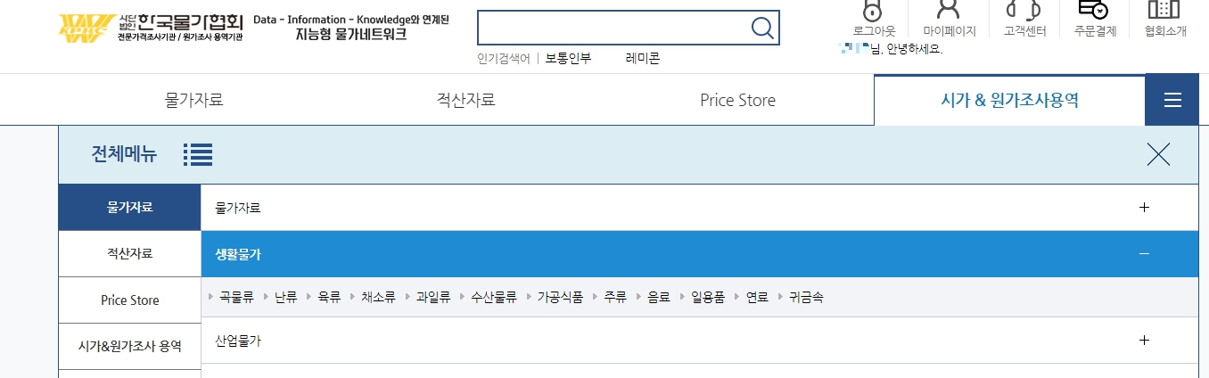 보시는 바와 같이 물가자료, 생활물가, 산업물가를 대표적인 품목에 한하여 조회할 수 있습니다.